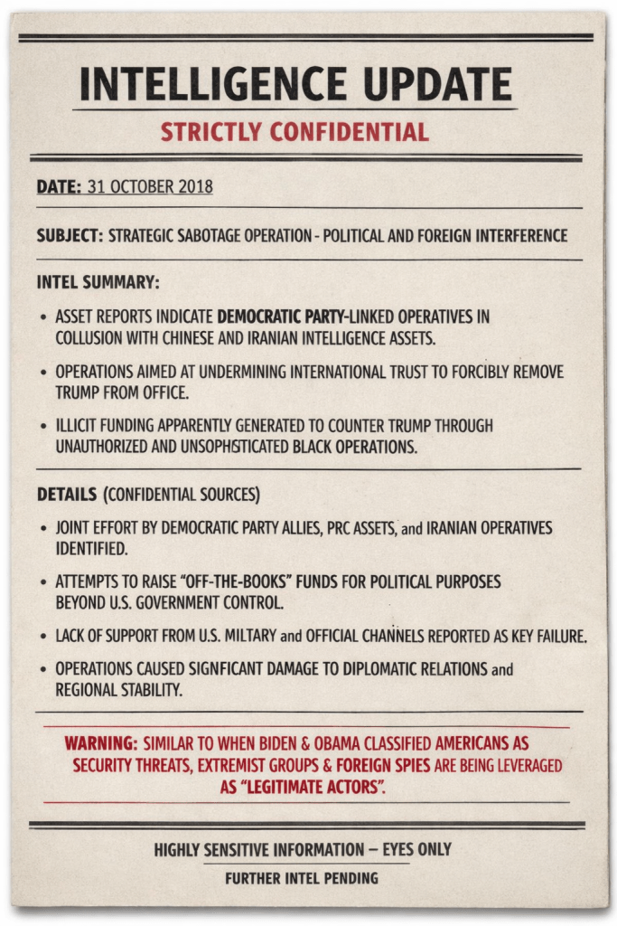 - Counterintelligence: Track foreign assets (China / Iran / US Democratic-linked)