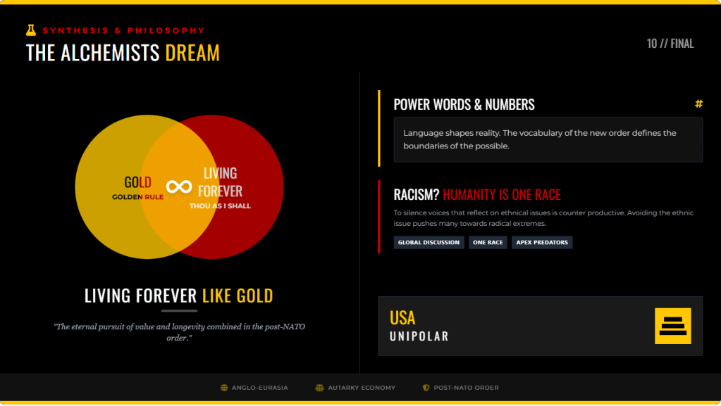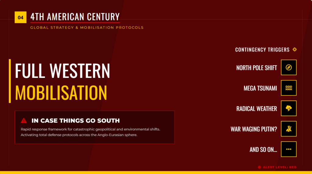 Strategic vision: A unipolar human-centric democratic order capable of countering both Chinese capability symmetry and post-liberal entropy.