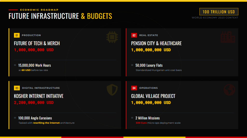 Lakhatási Forradalom ● 40 000 db, 10 lakásos „bunkerház” építése: ○ Ukrán határ mentén, biztonsági övezetként. ○ Budapest körgyűrűben, a lakhatási válság enyhítésére. ● Ez 400 000 új lakást teremt. ● Cél: az albérletárak 250 USD / hó alá szorítása. ● Fiatalok (12–28 év közöttiek) lakhatási igényeinek kielégítése. ● Kb. 8,15 milliárd USD beruházás, erős építőipari fellendülés